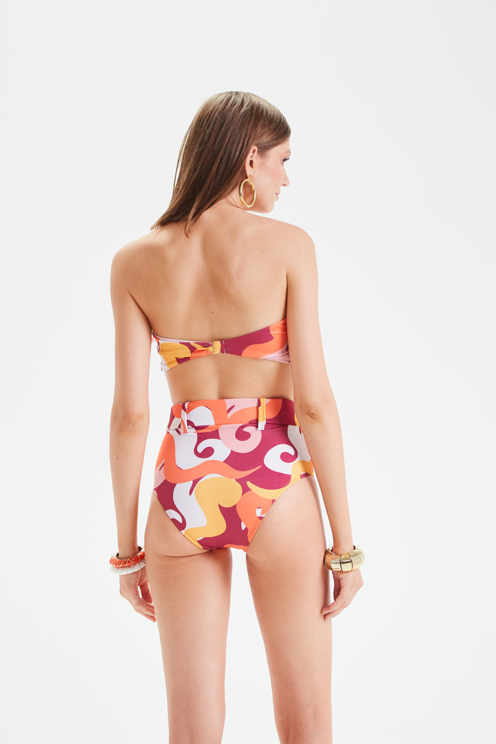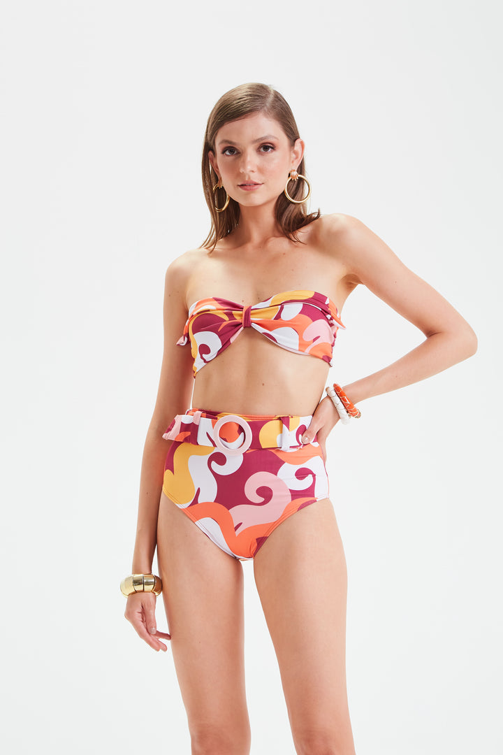 **Descrição:** Top com bojo e detalhe sobreposto no busto e hot pants malibu com cinto e fivela. Ambos na estampa geometric artsy.