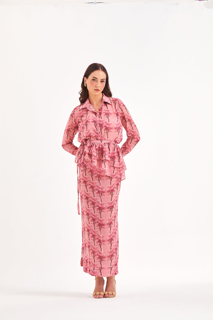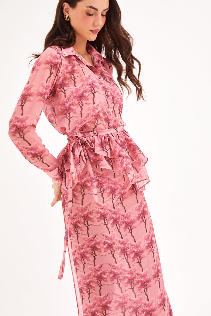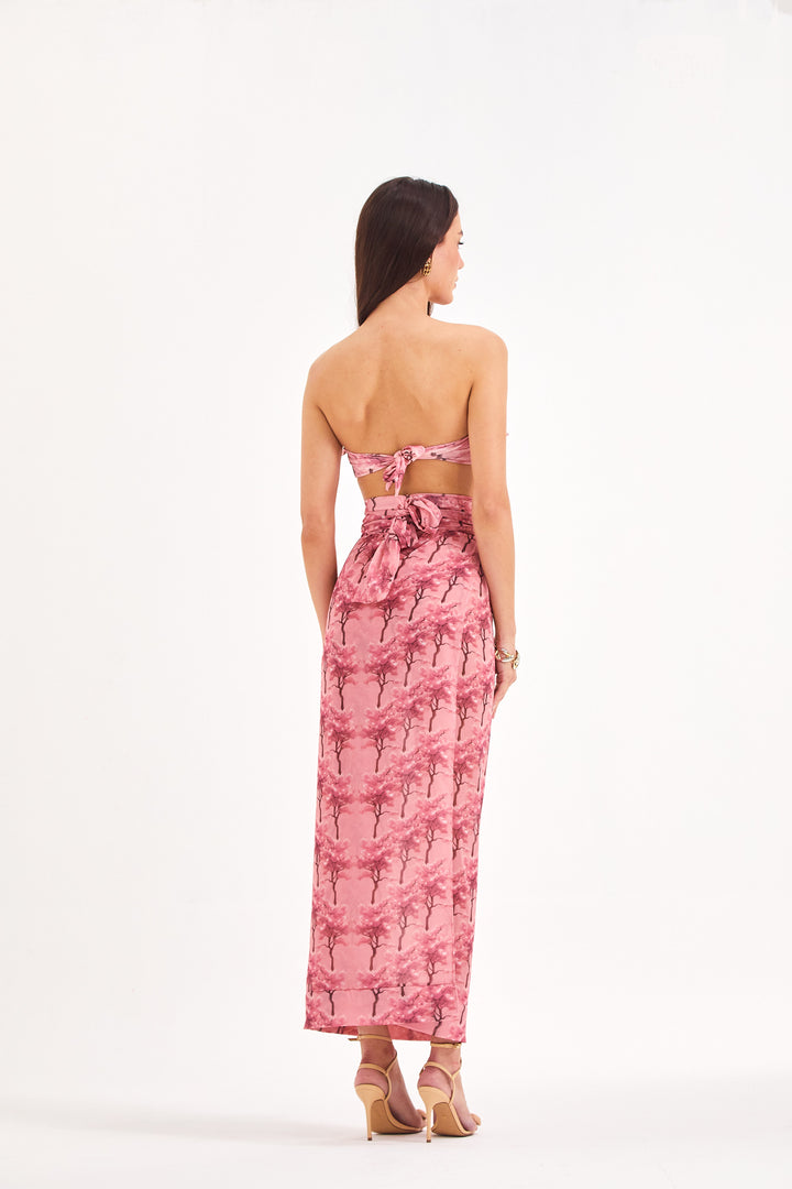 Composição: Tecido em crepe fluído toque de seda em estampa exclusiva Cerejeira Rose, 100% poliéster.