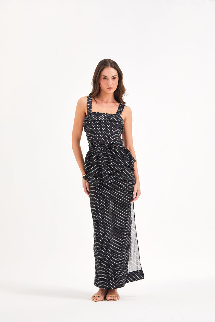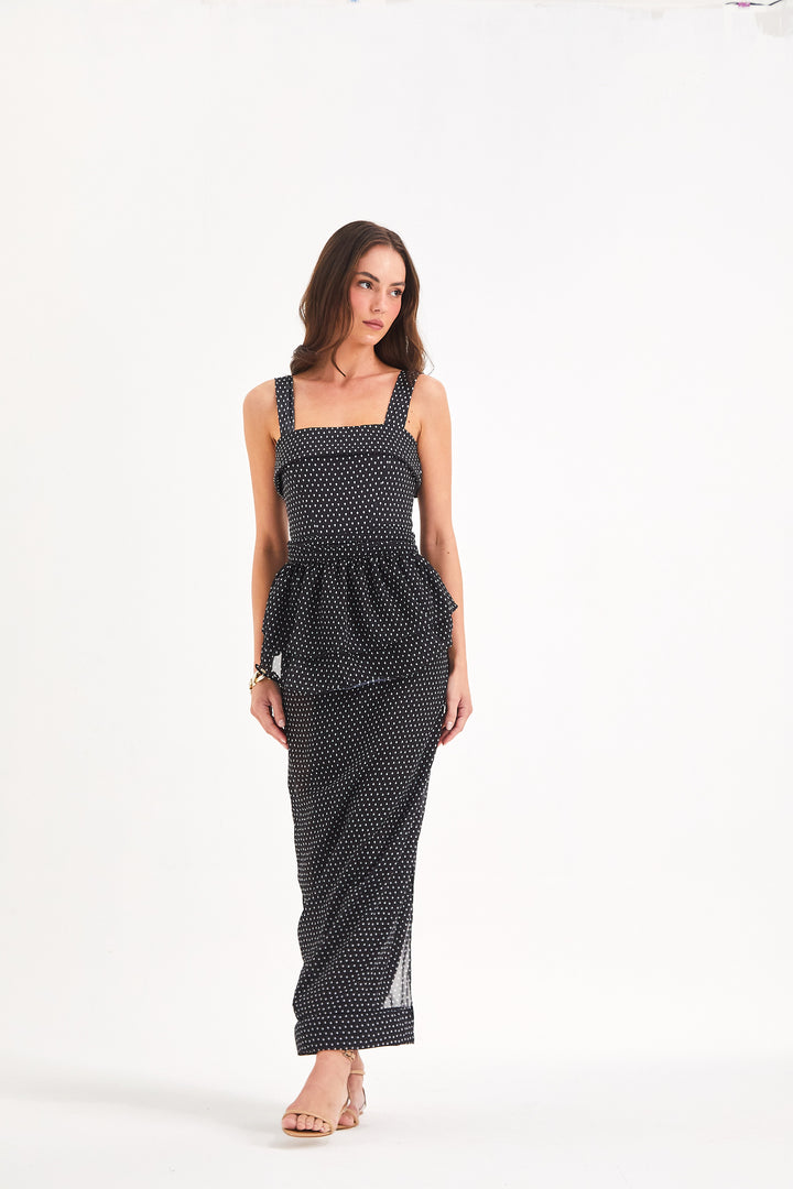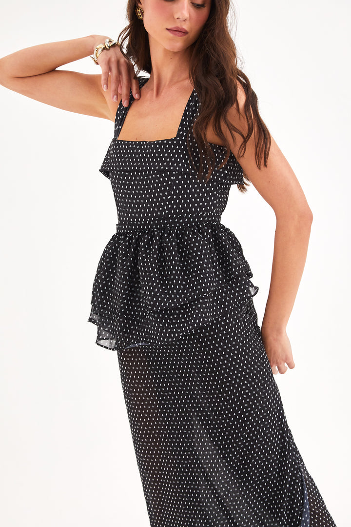 Composição: Tecido em crepe fluído toque de seda em estampa exclusiva Gotas Black, 100% poliéster.
