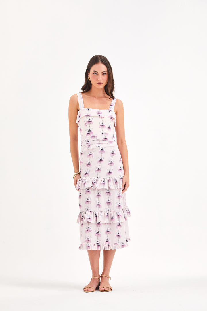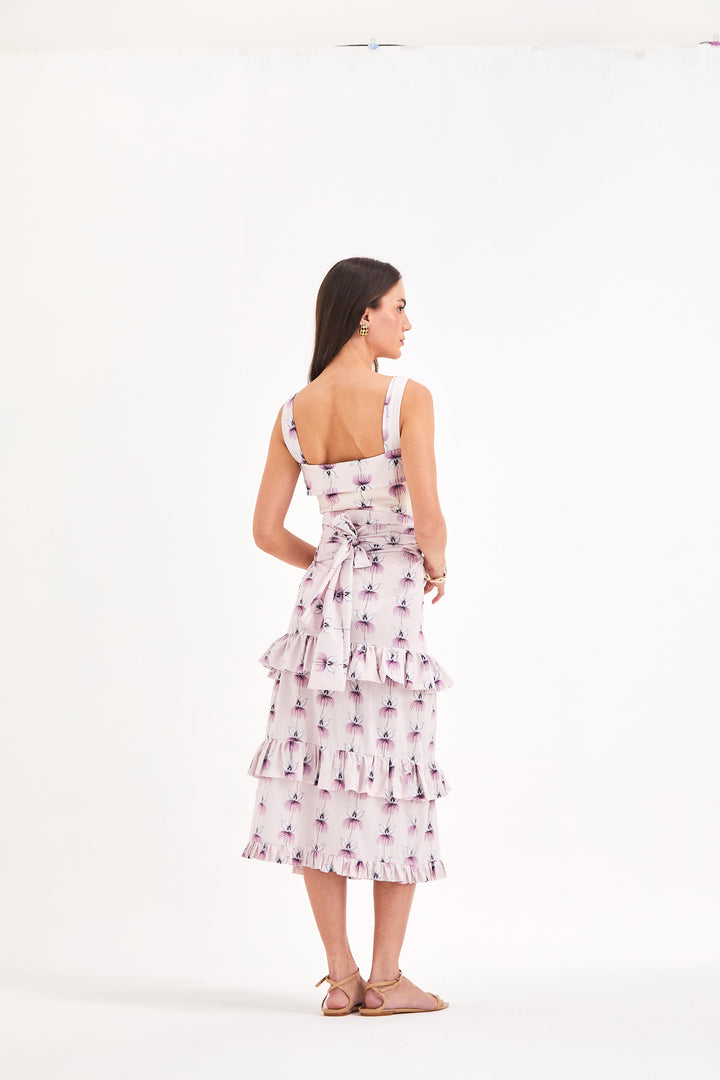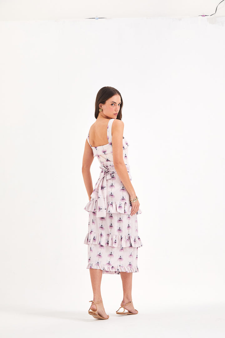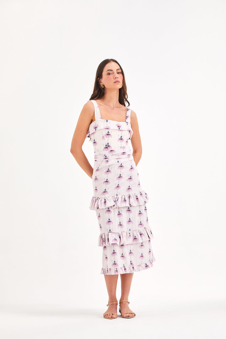 Comprimento mídi com mini babados franzidos sobrepostos no comprimento.