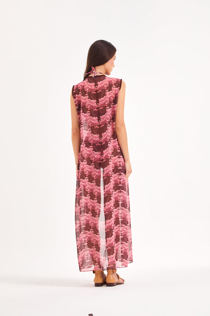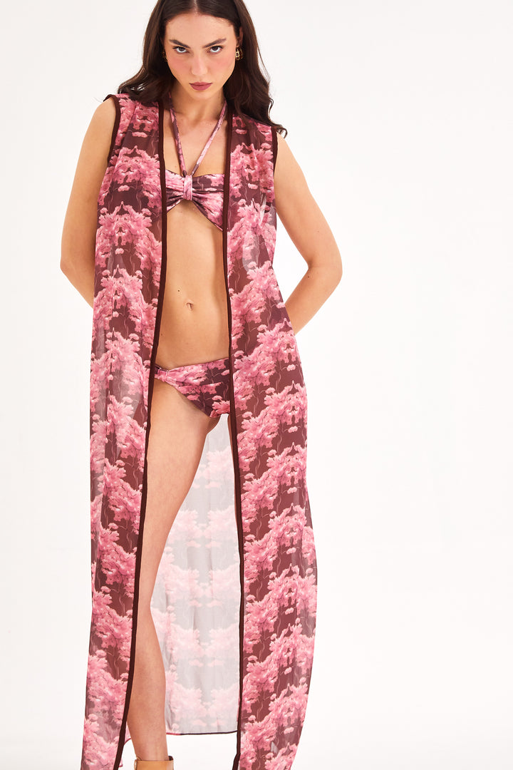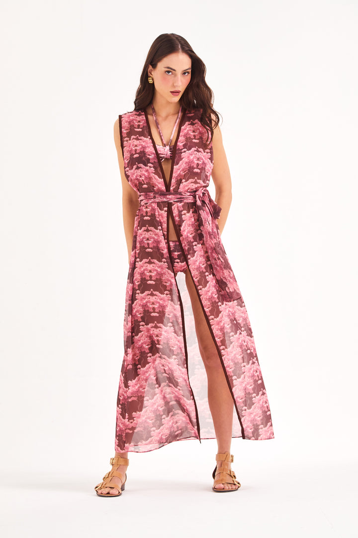 Detalhes: Crepe fluído toque de seda com leve transparência em estampa exclusiva Cerejeira Brown, 100% poliéster.