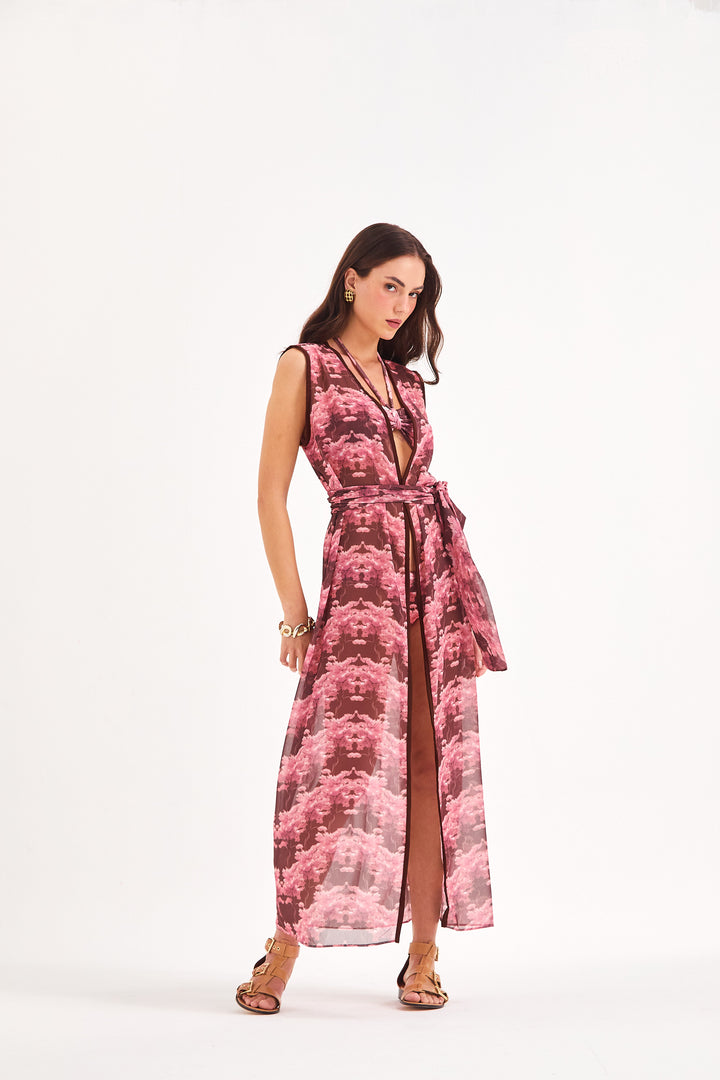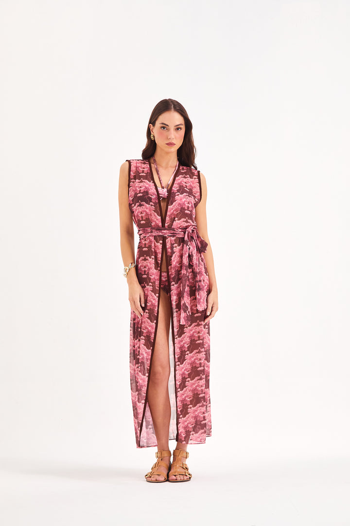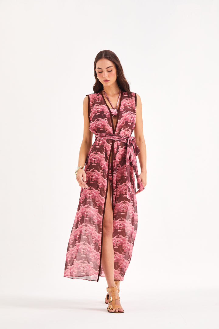 Descrição: Saída em formato de colete longo com sobreposição de capa em formato de babados em camadas removível.