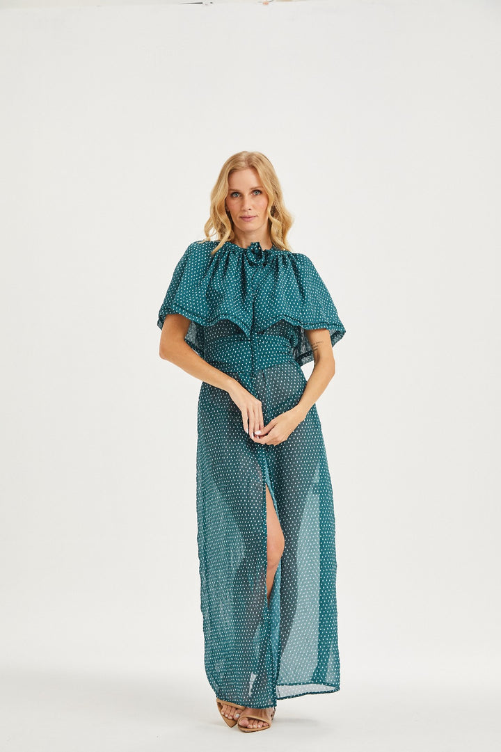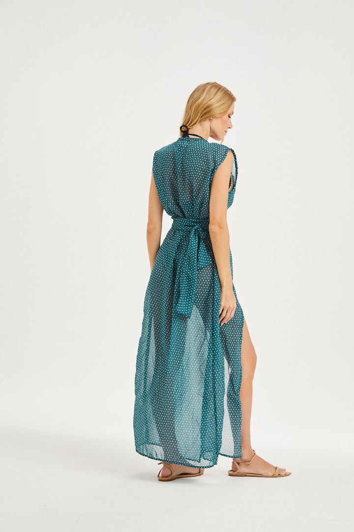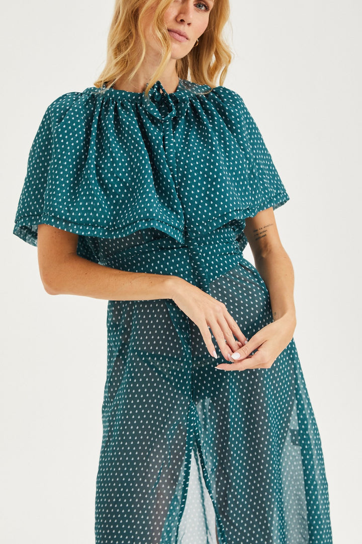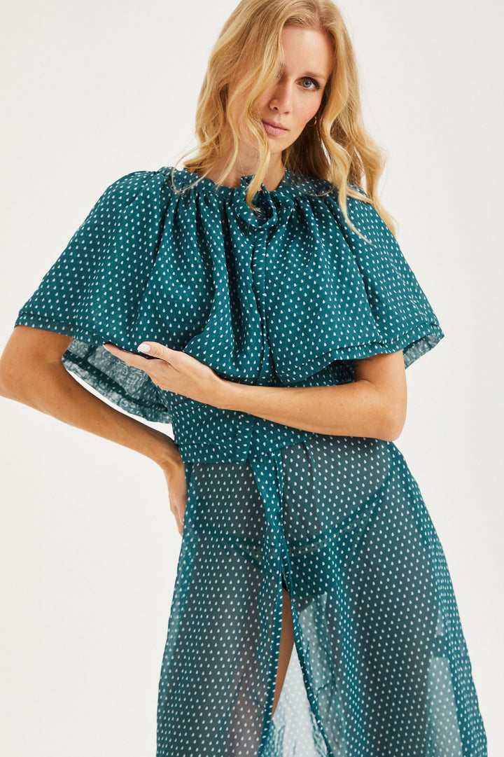 Descrição: Saída em formato de colete longo com sobreposição de capa em formato de babados removível.