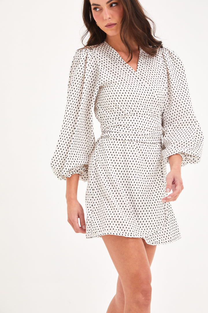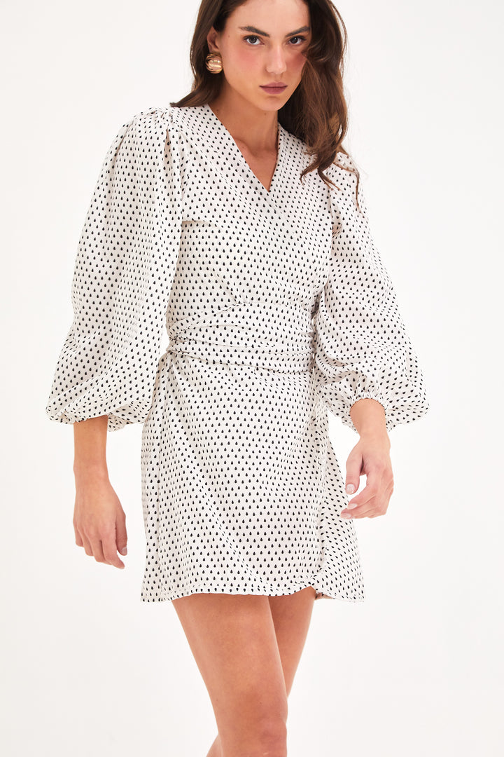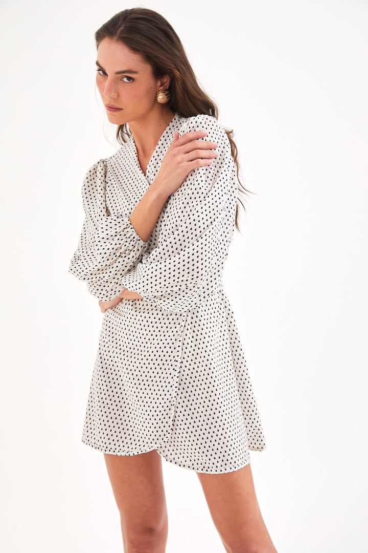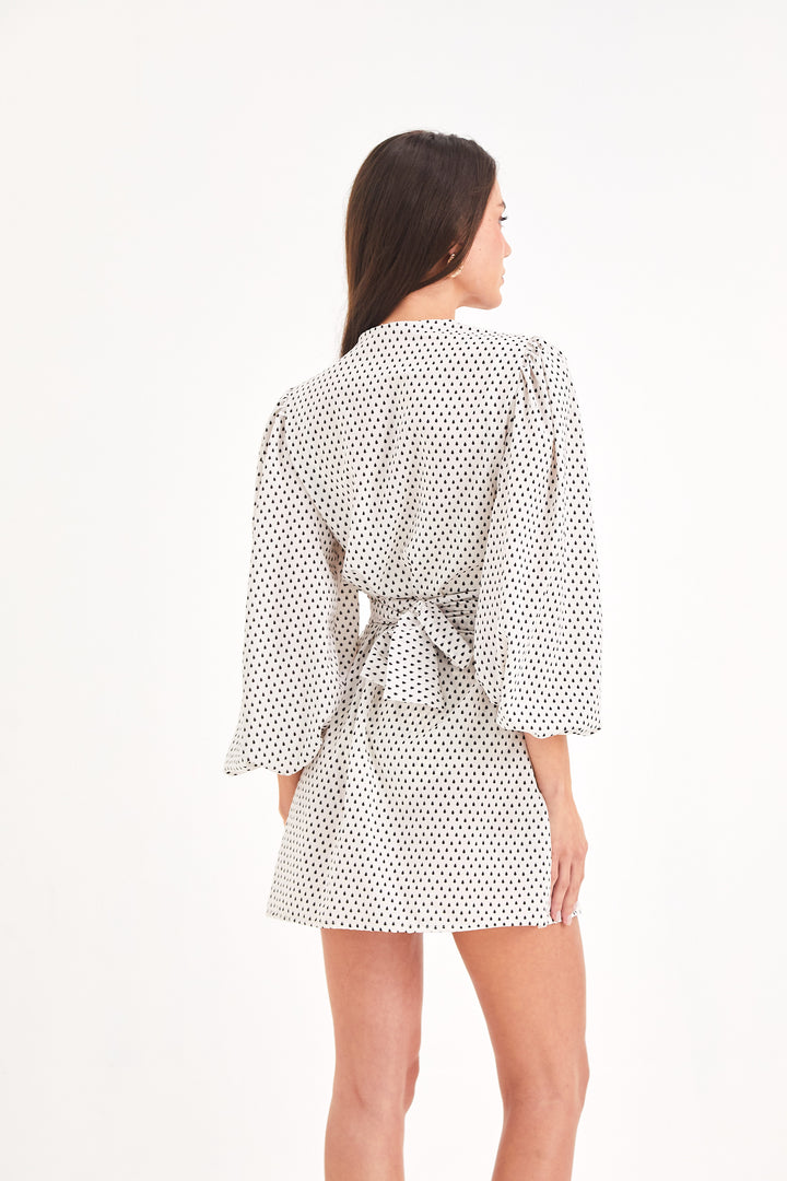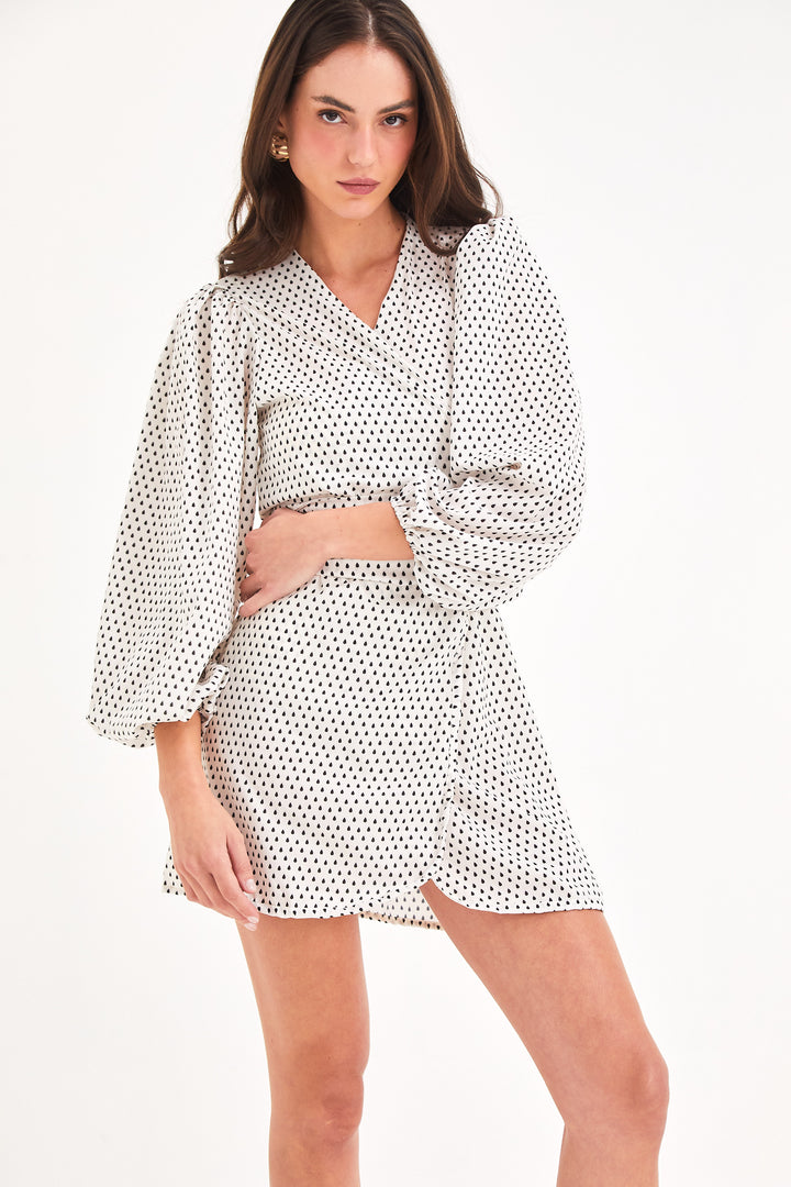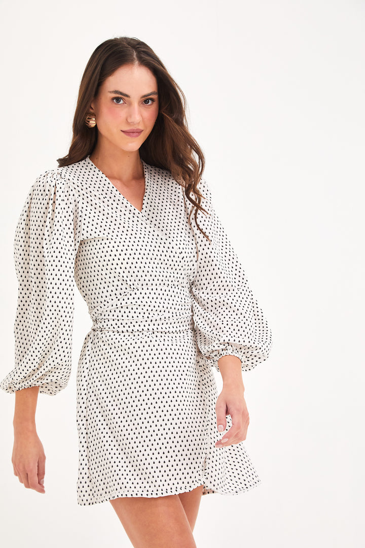 Composição: Crepe silk em estampa exclusiva Gotas Off White, 100% poliéster.