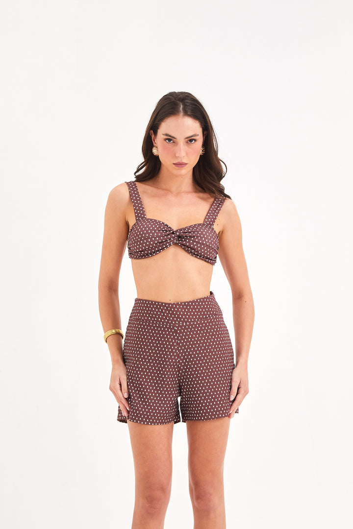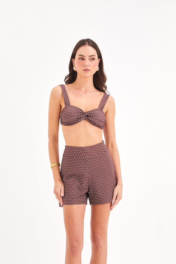 Composição: Short de alfaiataria em estampa exclusiva Gotas Expresso, 100% poliéster.