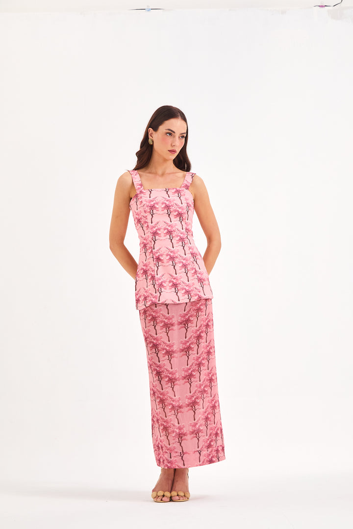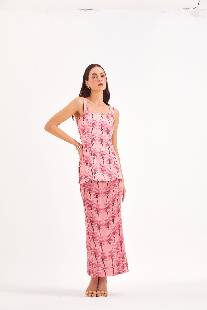 Composição: Top em Crepe alfaiataria e saia em tecido fluído com leve transparência em estampa exclusiva Cerejeira Rose, 100% poliéster.
